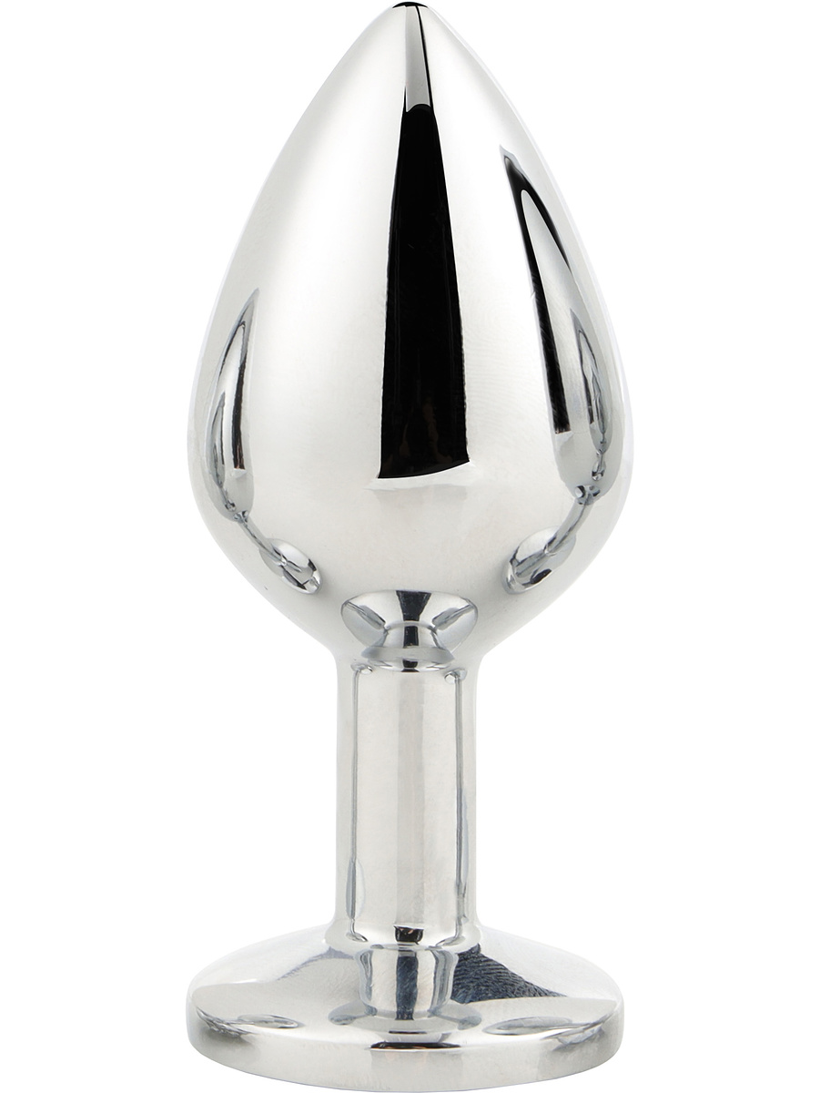 Analpluggen har en deilig sølvfarge som matcher den gjennomsiktige steinen i bunnen. Den er laget av lett og sømløs aluminium som sammen med den avsmalnende toppen gir en behagelig inngang. Den brede og runde basen hindrer den i å skli for langt inn, samtidig som smykket sitter komfortabelt mellom baken.