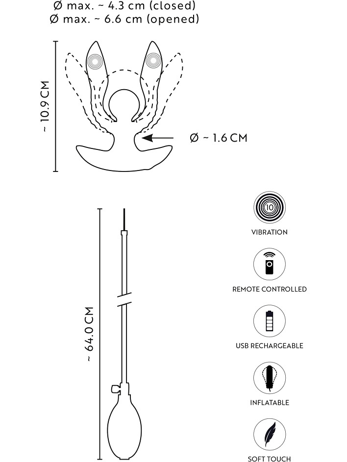 RC Inflatable Expander Plug fra Anos er perfekt for deg som elsker følelsen av å bli fylt, strukket og utforske dypere stimulering. Pluggen settes enkelt inn når de to armene holdes sammen – og når den er på plass, kan den oppblåsbare midtkulen utvide seg og åpne armene for en kraftig og tilfredsstillende følelse i analkanalen.
