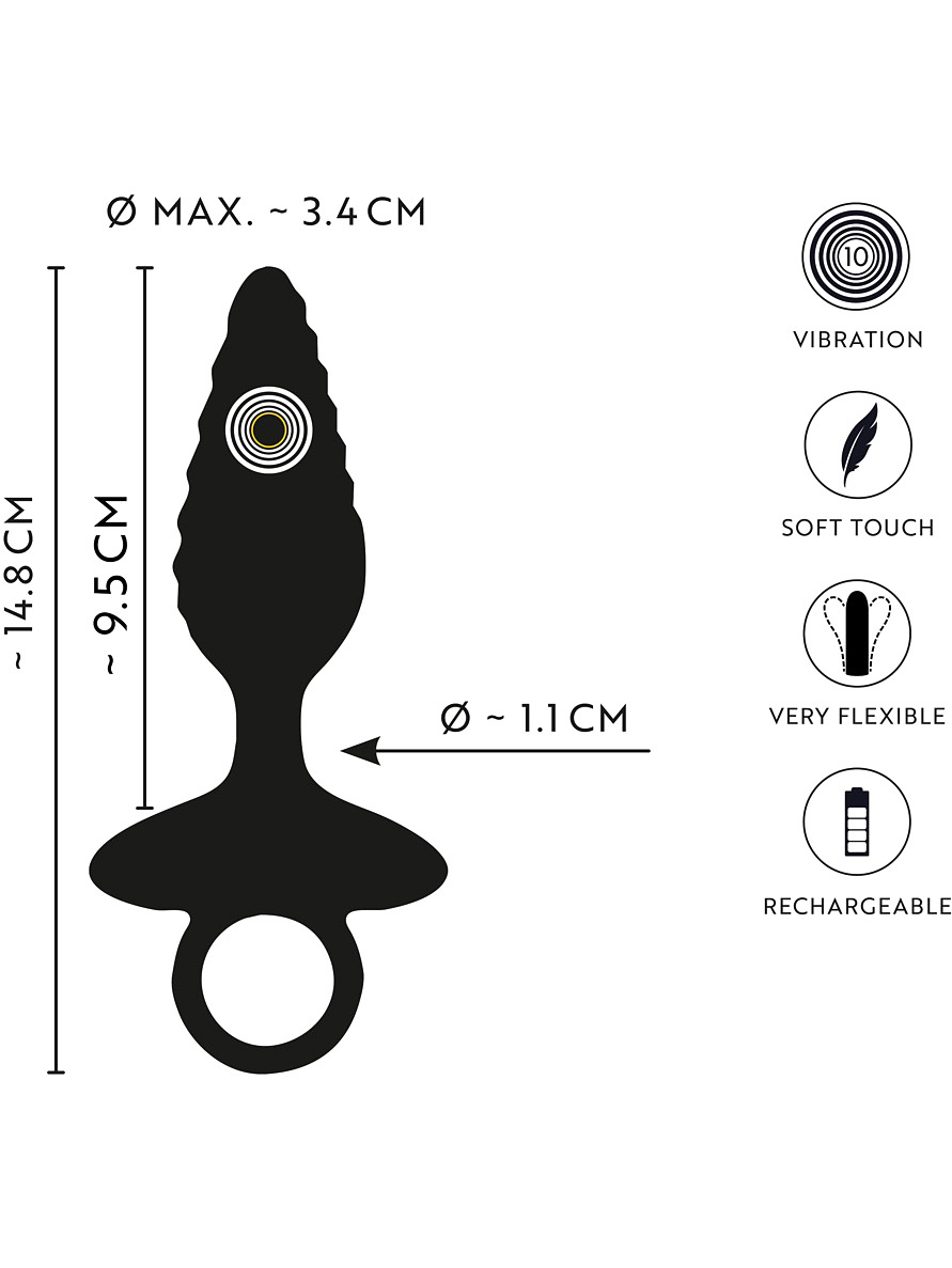 Pluggen er laget av kroppssikker, ftalatfri silikon som er både myk og fleksibel. Den tilpasser seg kroppen og bevegelsene for en trygg og komfortabel opplevelse. Den brede basen med en praktisk ringformet stopp fungerer som et sikkert håndtak som gjør leken enkel å kontrollere – og hindrer at pluggen settes for langt inn.