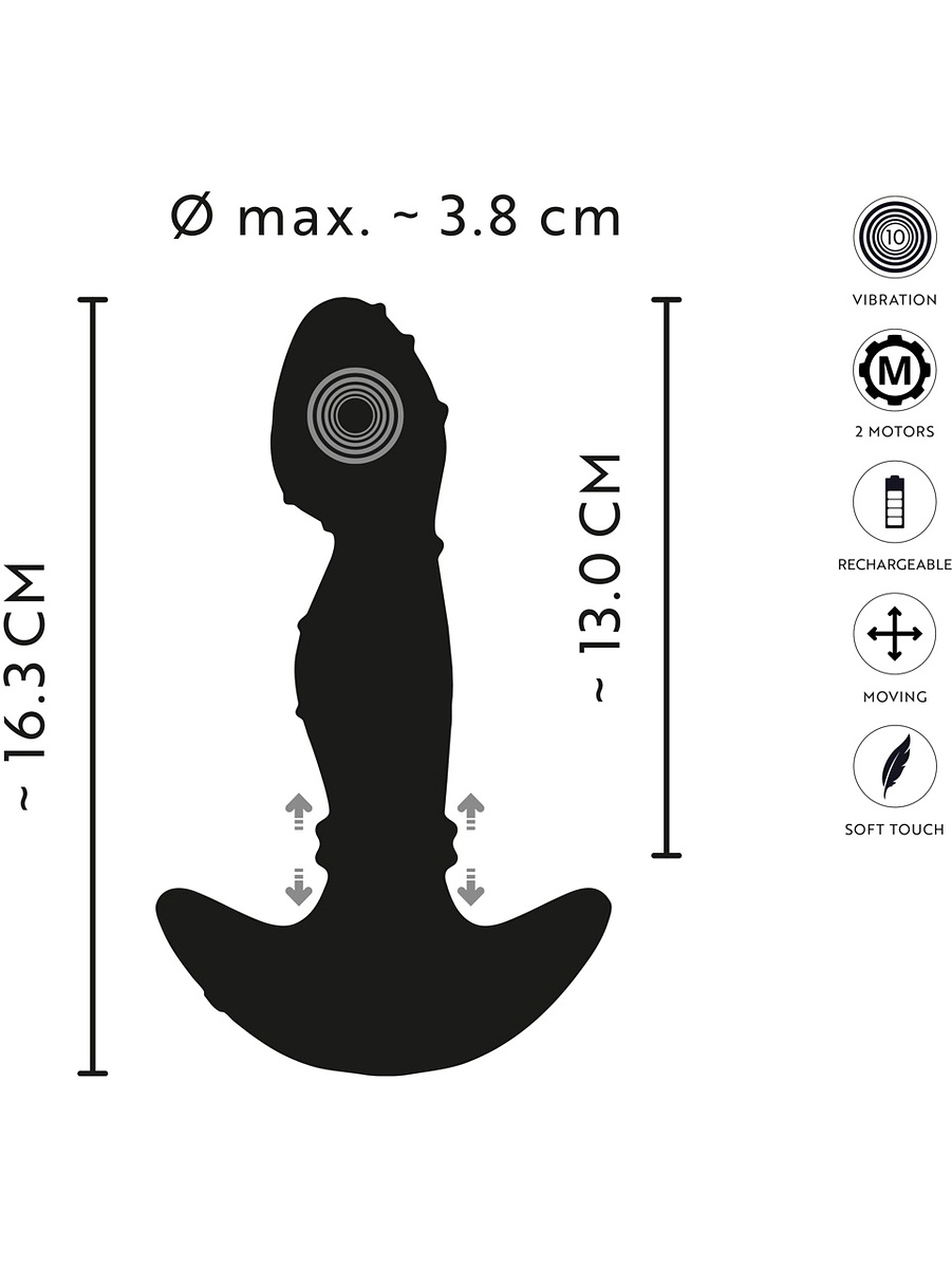 Opplev total stimulering med den vibrerende prostatapluggen med bevegelige ringer fra ANOS – en innovativ prostatavibrator som kombinerer dype P-punktvibrasjoner med en opplevelse som ligner på en ekte rimmingmassasje. To kraftige motorer og bevegelige ringer jobber sammen for å skape en intens følelse som får hver nerve til å vibrere.
