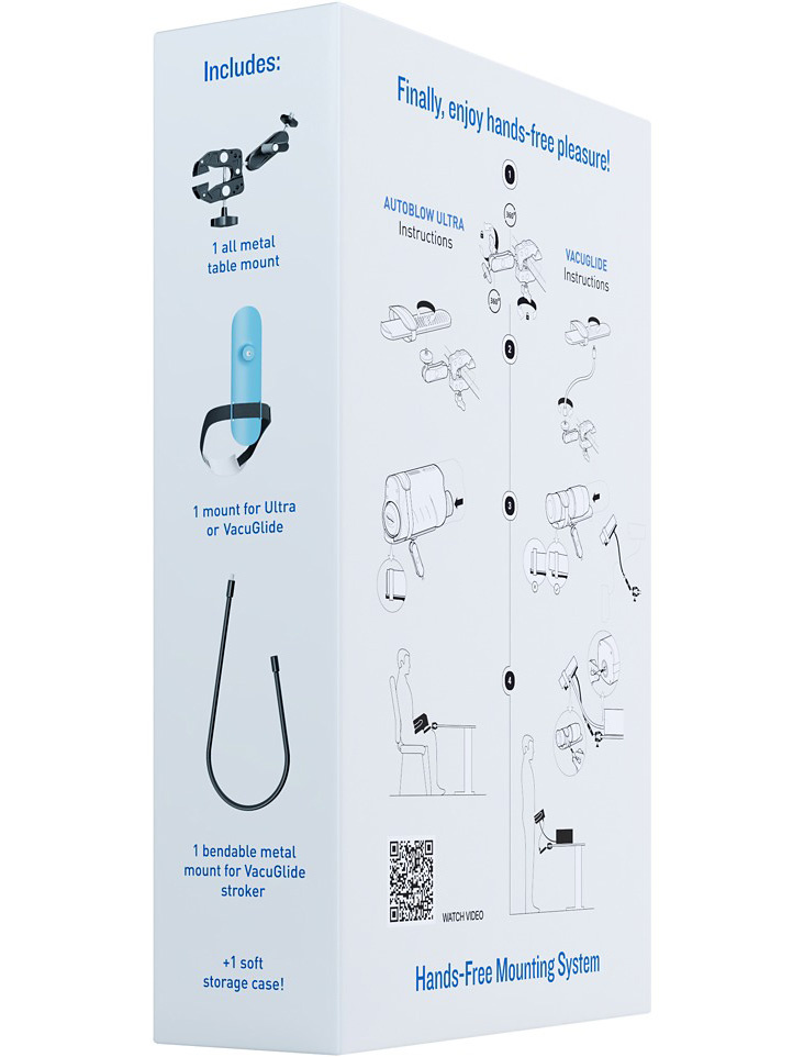 Hands-Free Mounting System fungerer med både Autoblow AI Ultra og VacuGlide, og leveres med en monteringsbrakett for hver modell. Uansett hvilken du bruker, får du en stabil og komfortabel håndfri opplevelse hver gang.