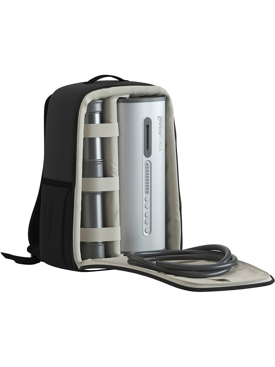 Maskinen og alt tilbehør leveres i en ryggsekk av høy kvalitet med spesialtilpassede rom for hver del. Perfekt for diskret oppbevaring og enkel transport. Selve maskinen er omtrent 40 cm lang og 15 cm bred.