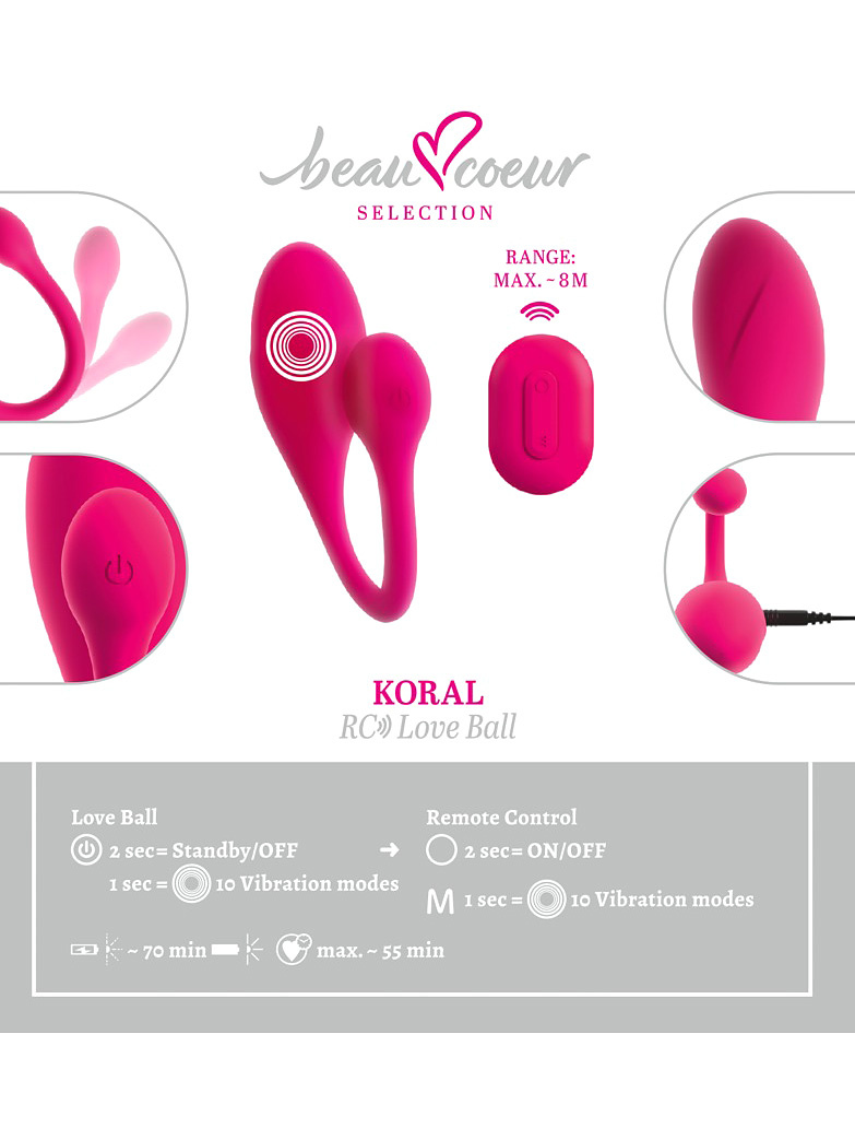 Koral RC Love Ball fra beau cœur er designet for å gi deg diskret stimulering når du vil – uansett hvor du er. Med sin elegante form, intense vibrasjoner og fleksible design kombinerer den nytelse med bekkenbunnstrening på en sensuell måte. Den stillegående motoren lar deg nyte i det skjulte, enten du er hjemme, på tur eller i sengen.