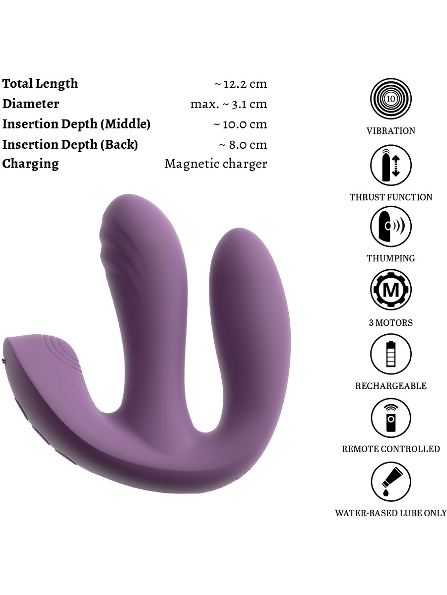 Med den trådløse fjernkontrollen (rekkevidde opptil 8 meter) kan du enkelt bytte mellom moduser og rytmer – eller la partneren din ta kontroll. De intuitive kontrollene gjør lek enkelt og fristende, både når de brukes alene og i par.