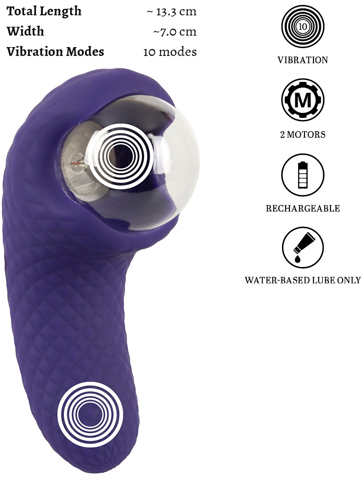 Den avrundede glasskulen gir hypnotisk klitorisstimulering og sensuelle lyseffekter under utvortes lek, mens den andre enden med sin elegante diamantstruktur gir dypere stimulering. Du kan bruke begge sider separat eller kombinere vibrasjonene for en tilpasset opplevelse.