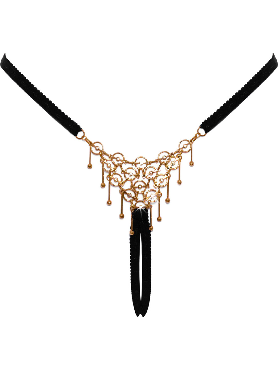 Dekorasjonen består av ringer, små kjeder, glitrende steiner og svingende stenger med kuler i endene som beveger seg lekent mot huden. Linningen er justerbar i sidene for perfekt passform, og det åpne skrittet gjør den like forførende som den er praktisk for øyeblikk som ikke bør avbrytes.