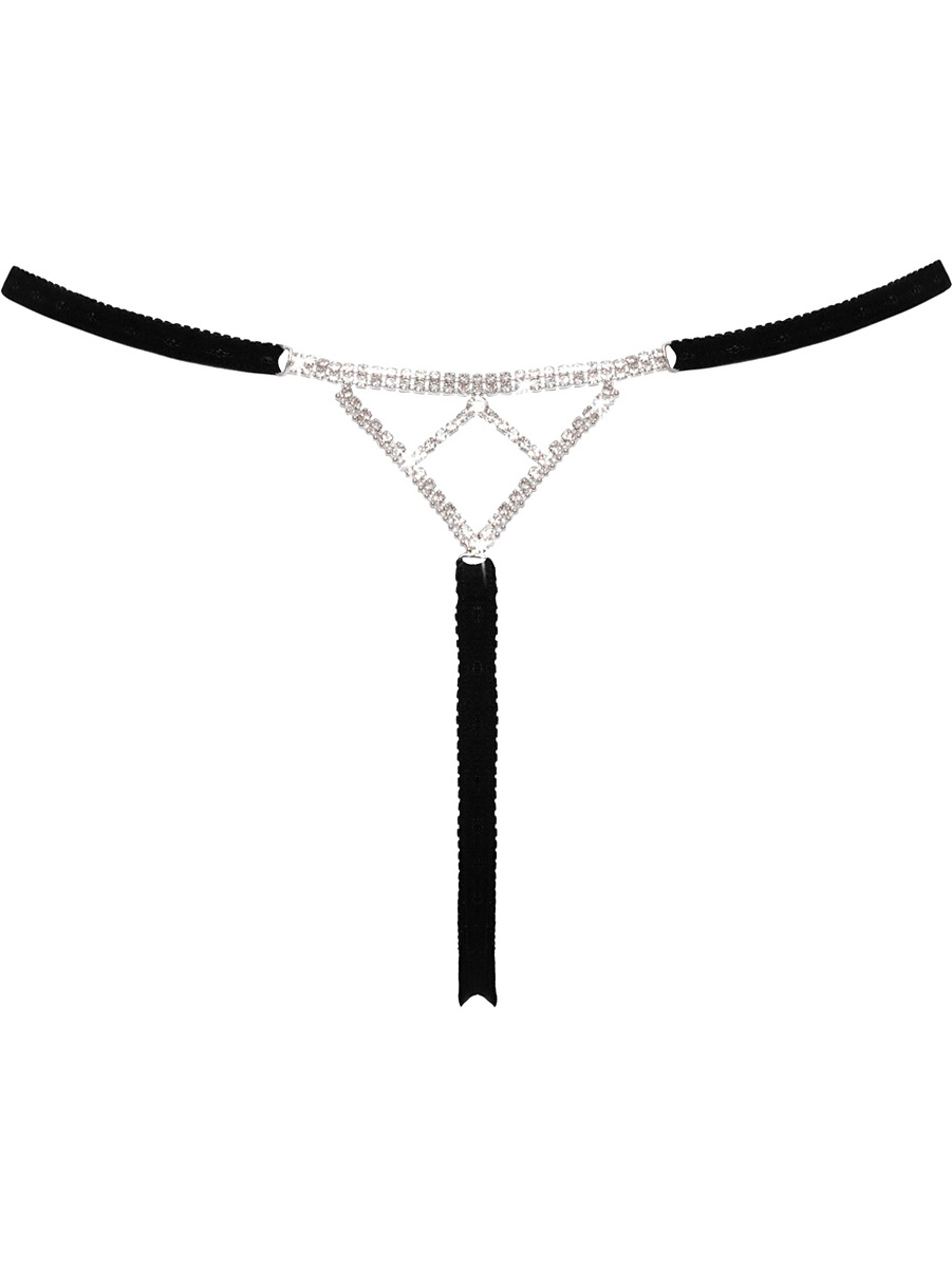 Forsiden og baksiden av trusen er utsmykket med dekorative trekanter dekket av glitrende strass som fanger lyset med hver bevegelse. Linningen er justerbar i sidene for perfekt passform, og det åpne skrittet gjør designet like forførende som det er praktisk for øyeblikk som ikke bør avbrytes.