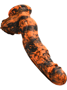 La fantasiene flyte med denne fantasy-dildoen, inspirert av den sabeltannede tigeren. Den oransje og svarte kamuflerte dildoen har riller, rygger og andre teksturer som kroppen din aldri har opplevd før. Det kjøttfulle hodet og det tykke, buede skaftet møter de poteformede kulene ved basen.