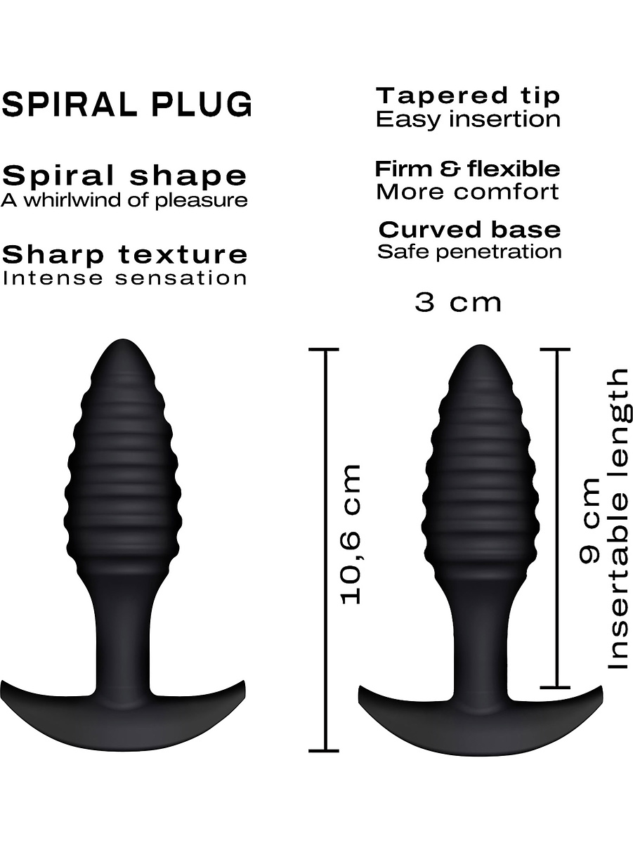 Spiral Plug er en fleksibel analplugg som gir fantastisk analstimulering takket være spiralmønsteret og det silkemyke silikonmaterialet. Spiralmønsteret har en skarp tekstur for intens stimulering. Den avsmalnende toppen gir en komfortabel inngang mens den buede ankerbasen garanterer sikkerhet.