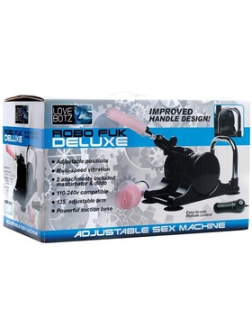 Robo Fuk Deluxe er et helautomatisk sexleketøy som penetrerer deg i forskjellige intensitetsnivåer og fra alle tenkelige vinkler og høyder. Vinkelen kan justeres hele 135 grader, noe som gjør alle posisjoner mulig. Du justerer enkelt intensiteten ved å vri på hjulet på kontrollboksen. Den kan oppnå hele 180 thrusts i minuttet.