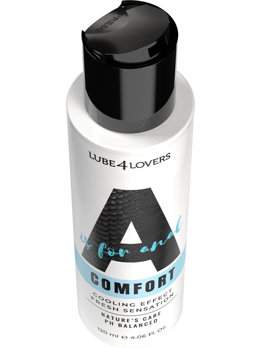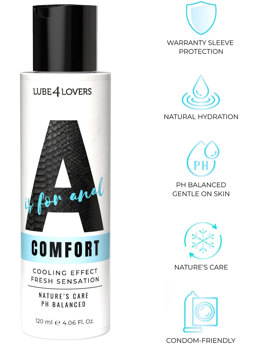 A is for Comfort er et vannbasert glidemiddel utviklet for analsex for å gi trygg og langvarig glid. Den pH-balanserte formelen er dermatologisk testet og beriket med naturlig fuktighetsgivende ingredienser for en komfortabel opplevelse.