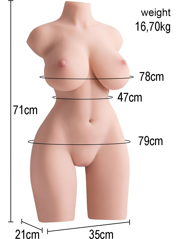 Med en vekt på hele 16,7 kg og naturtro mål – 78 cm over bysten, 47 cm over midjen og 79 cm over hoftene – får du en stabil og realistisk opplevelse som holder modellen på plass selv under mer intense økter.