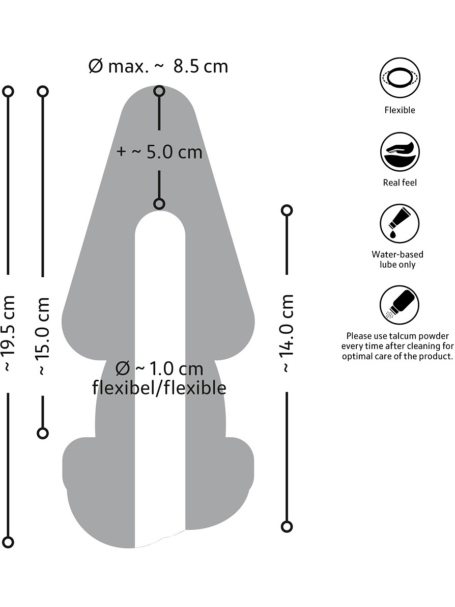 Produktet er laget av Nature Skin-materiale som er mykt, hudlignende og svært fleksibelt. Overflaten ser realistisk ut og føles glatt mot huden, mens materialet er elastisk og enkelt å bruke – også for nybegynnere.