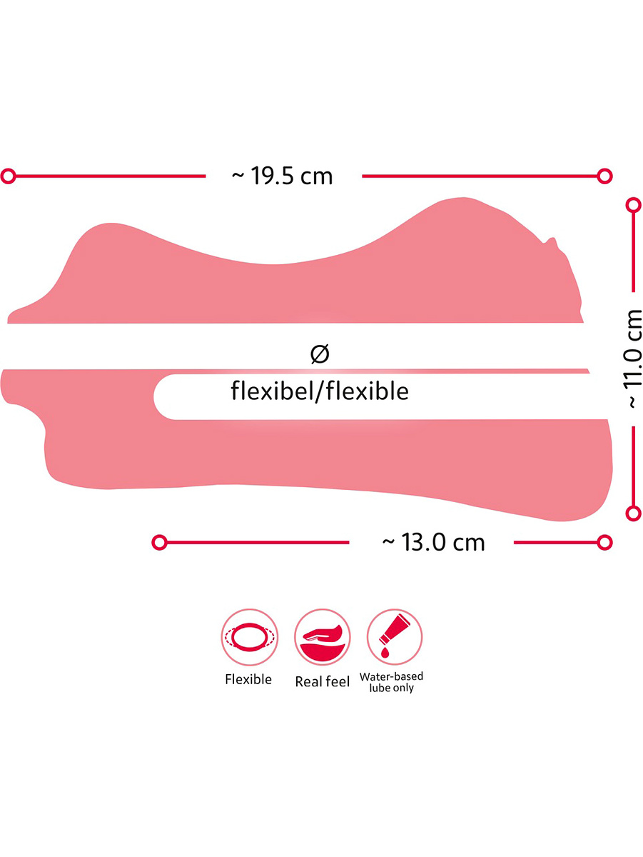 Den kontinuerlige tunnelen for munn og vagina gjør den egnet for alle penislengder og er enkel å rengjøre, mens den separate analåpningen er omtrent 13 cm dyp og fleksibel.