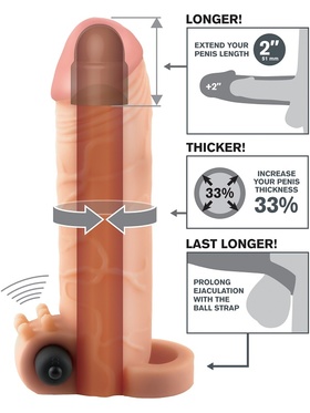 Overtrekket er laget i mykt og fleksibelt Fanta Flesh-materiale, som gir en hudlignende følelse både for deg og din partner. Med 5,1 cm ekstra lengde og omtrent 33 % økt omkrets, vil partneren din virkelig merke forskjellen – og du vil nyte en enda kraftigere ereksjon takket være den medfølgende ringen som plasseres rundt pungen for å fremme blodstopp og utholdenhet.