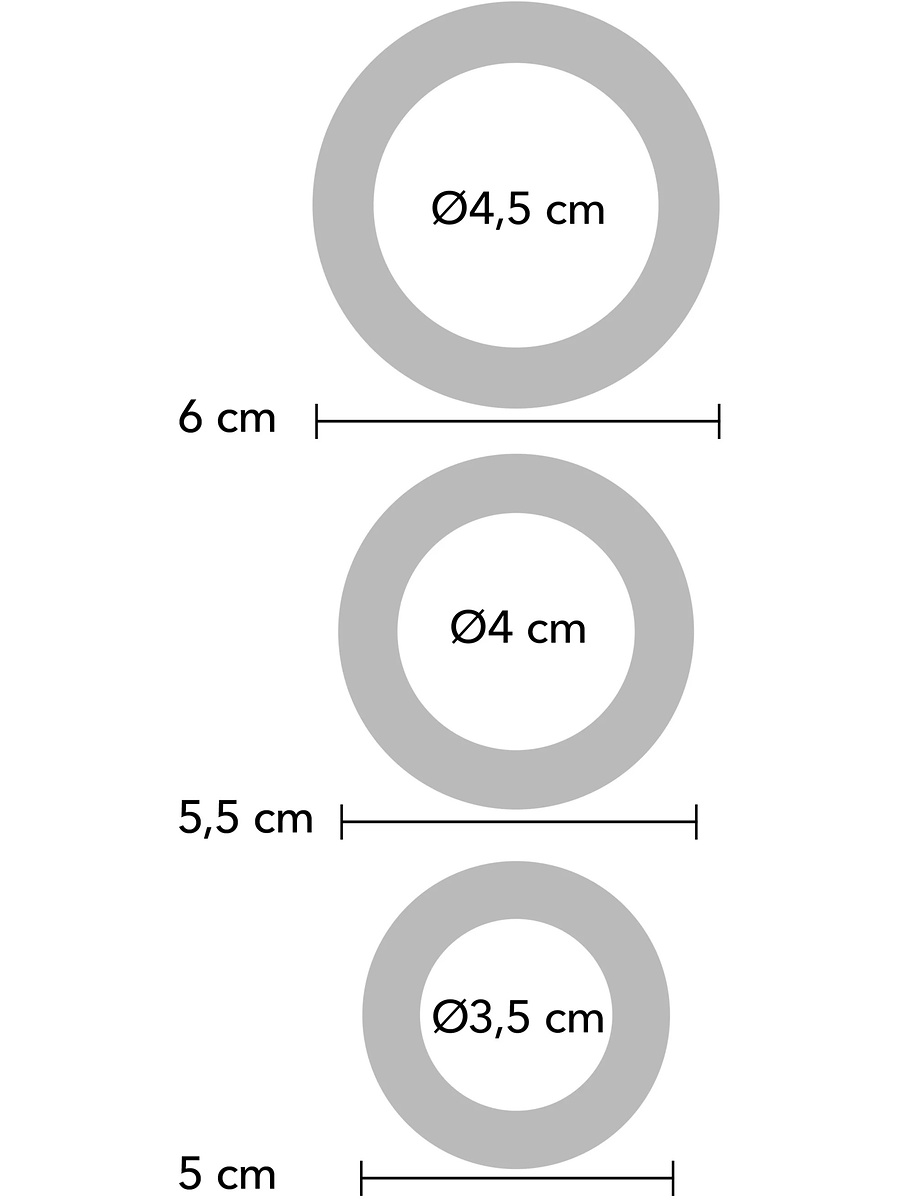 Ringene har følgende indre diameter: S: 3,5 cm / M: 4,0 cm / L: 4,5 cm