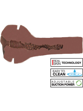 Den myke hylsen i kvalitet og slitesterk TPR har en vaginaåpning som gir en realistisk følelse. Innsiden har en variert tekstur med stimulerende knotter og riller. Skallet gir deg et behagelig grep og i bunnen er det et lite hull som lar deg justere sugefølelsen selv ved å legge fingeren over hullet.