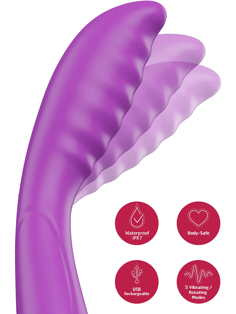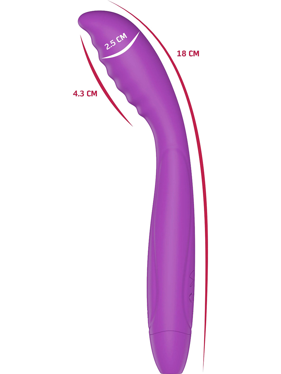 Vibratoren er laget av myk, kroppssikker silikon med en silkemyk overflate som glir jevnt mot huden. Den ergonomisk buede formen gjør det enkelt å nå G-punktet, mens den solide basen gir stabilitet og kontroll selv under intense øyeblikk.