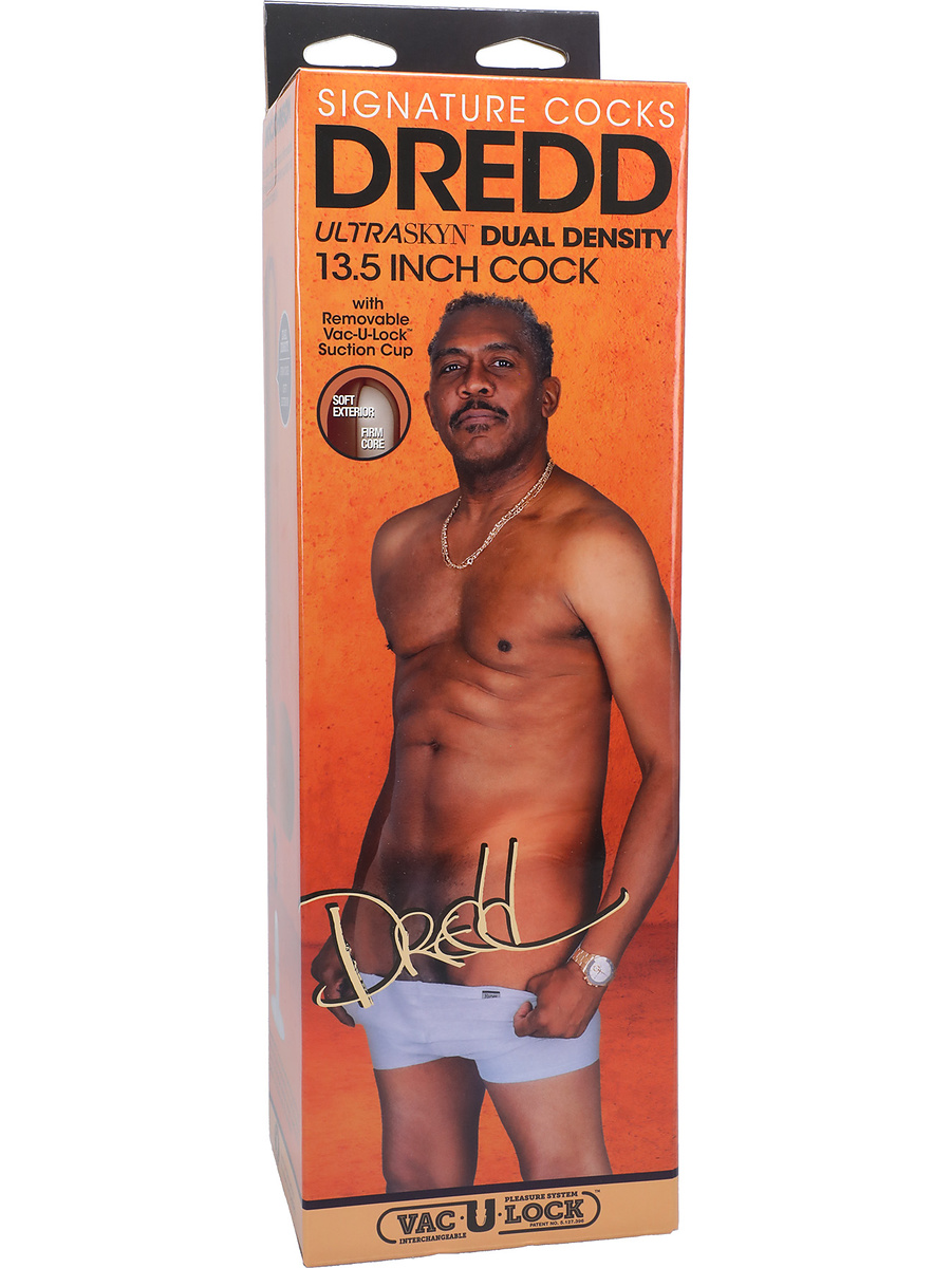 Denne dildoen er modellert etter pornostjernen Dredds imponerende penis og gjengir formen hans ned til minste detalj. Med en total lengde på 34 cm, en penetrerende lengde på 28 cm og en diameter på 5,7 cm gir den en betydelig og fyldig størrelse for deg som ønsker ekstra dyp og intens stimulering med en realistisk følelse.