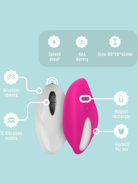 Trusevibratoren har en silkemyk silikonoverflate med en forhøyning som behagelig stimulerer klitoris. Leken har 12 forskjellige vibrasjonsmoduser for en herlig variasjon. Via den trådløse kontrollen kan du eller partneren din enkelt kontrollere vibrasjonsmodusene. Det er selvfølgelig også mulig å styre vibrasjonene via knappen på toppen.