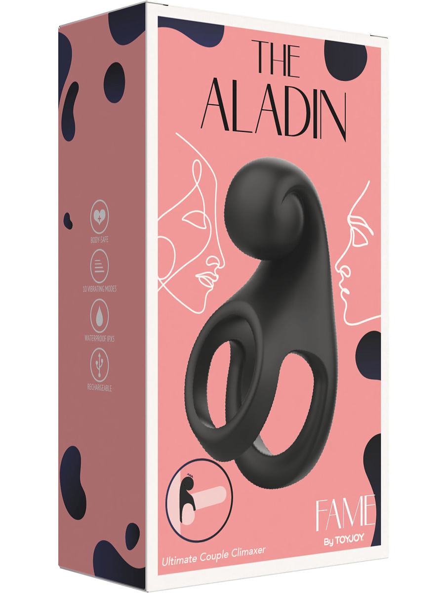 Opplev intens gjensidig stimulering med Aladinen fra TOYJOY Fame. Denne kraftige penisringen med dobbel ring er designet for å gi begge partnere en dypere og mer synkronisert opplevelse – der hver bevegelse forsterkes av rytmiske vibrasjoner.