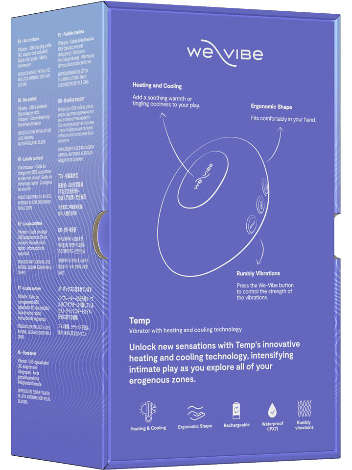 Med We-Vibe Temp kan du veksle mellom deilig varme (opptil 38 °C) og forfriskende kjølighet (ned til 20 °C). Temperaturforskjellen skaper kontraster som vekker lyst og intensiverer følelsen av berøring. Den avanserte temperaturteknologien lar deg eksperimentere med temperaturlek på en trygg og kontrollert måte – som isbiter og voks, men uten risiko.